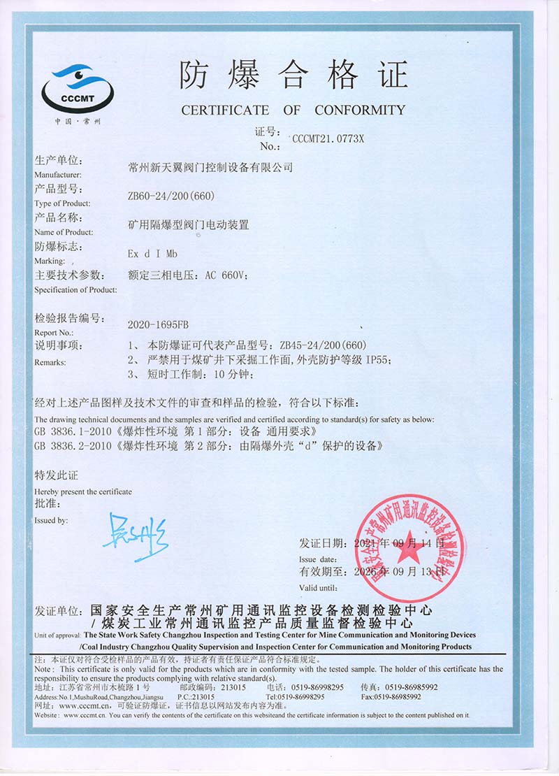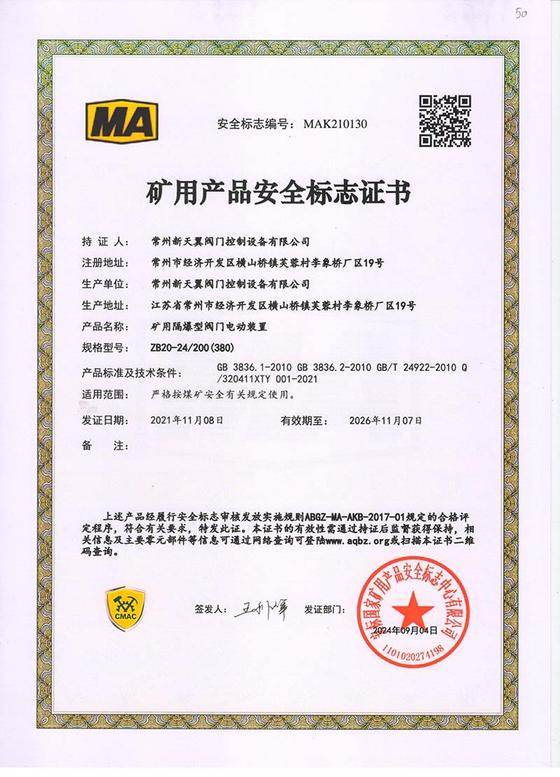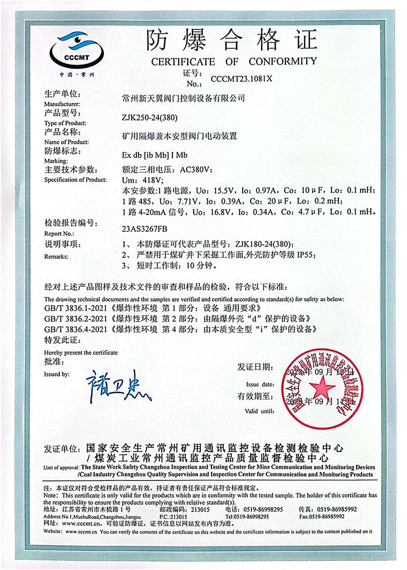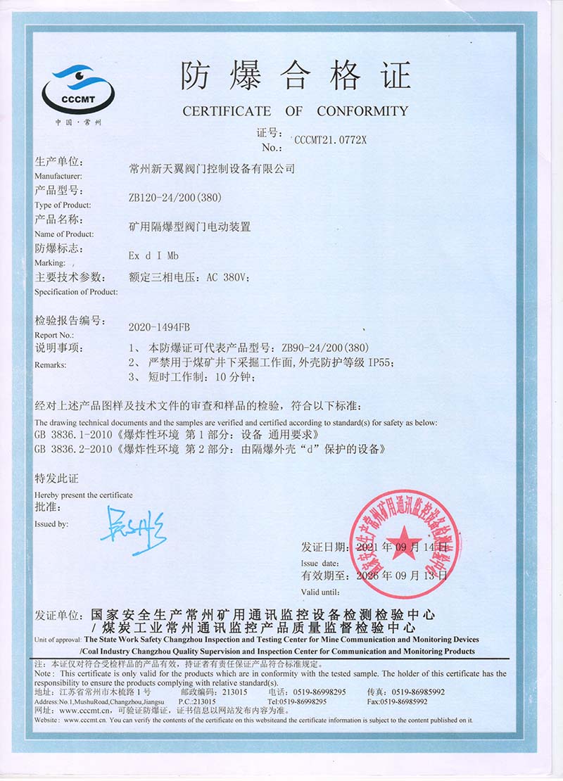 礦用隔爆ZB10-24中國國家強制性產品認證證書110.2