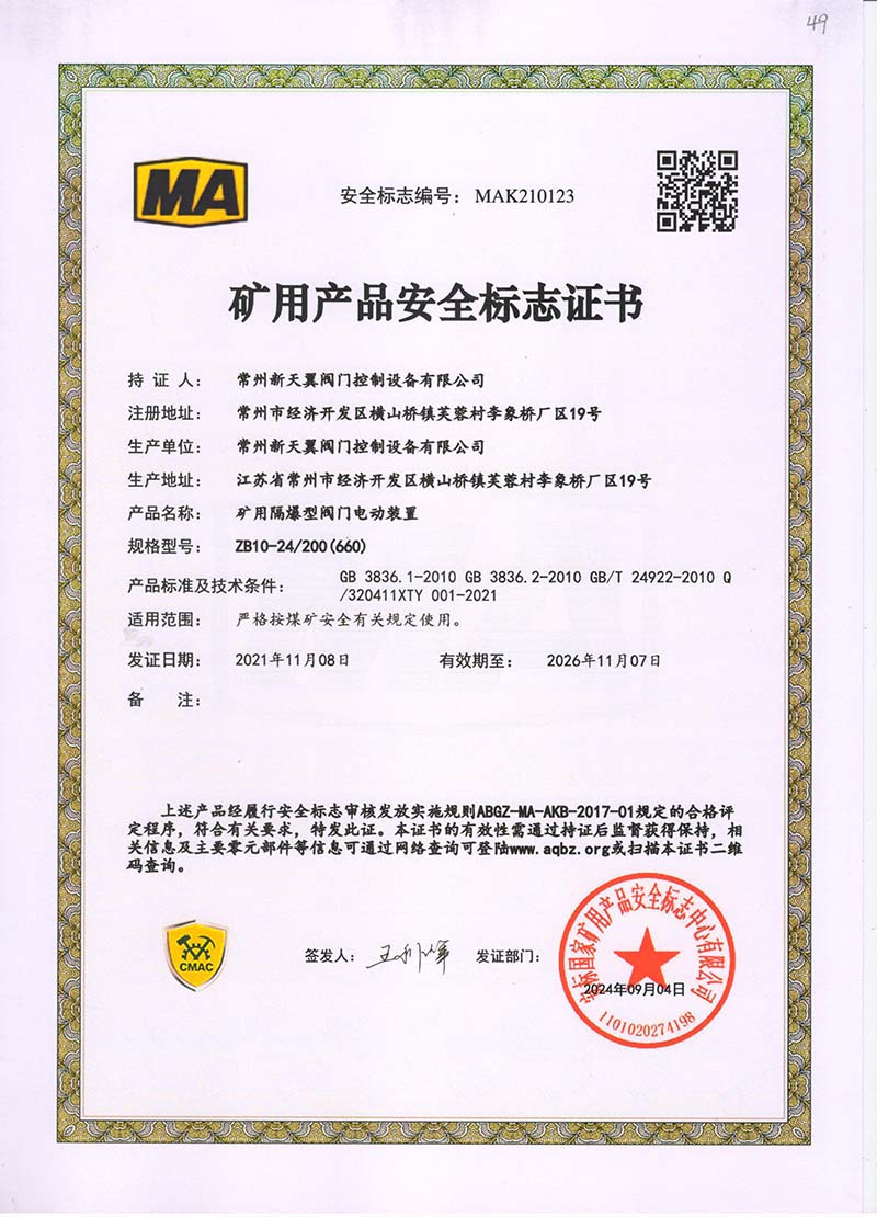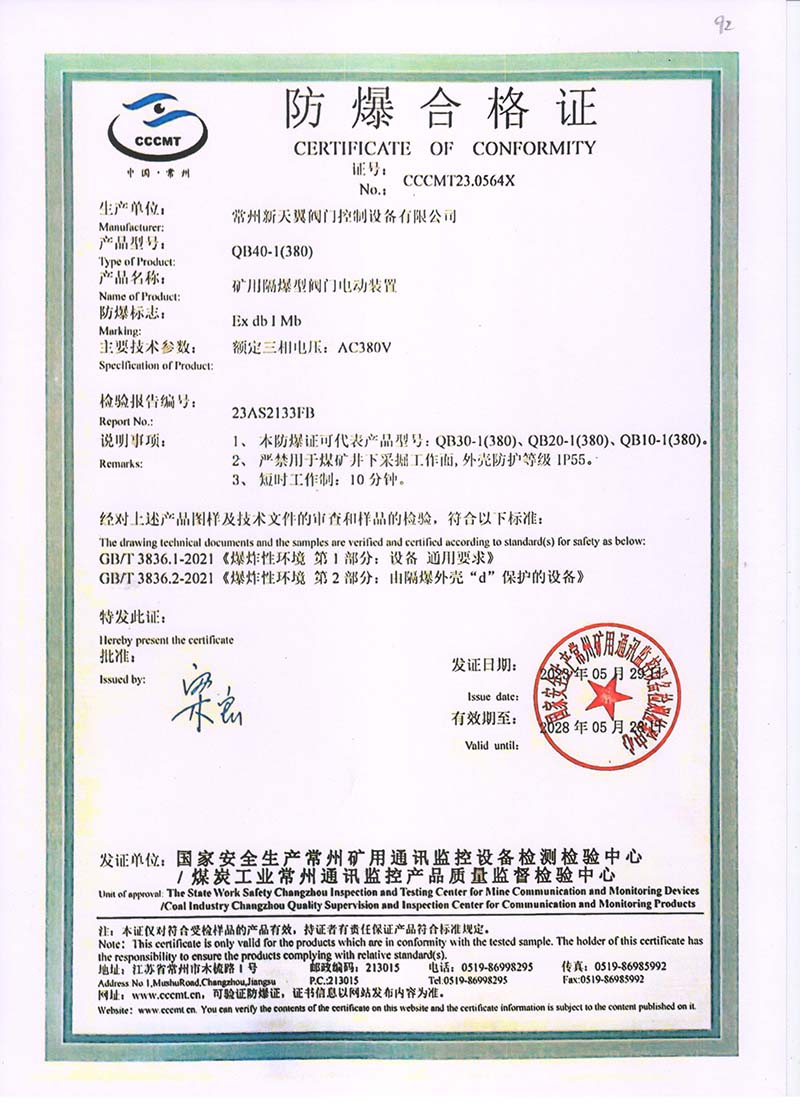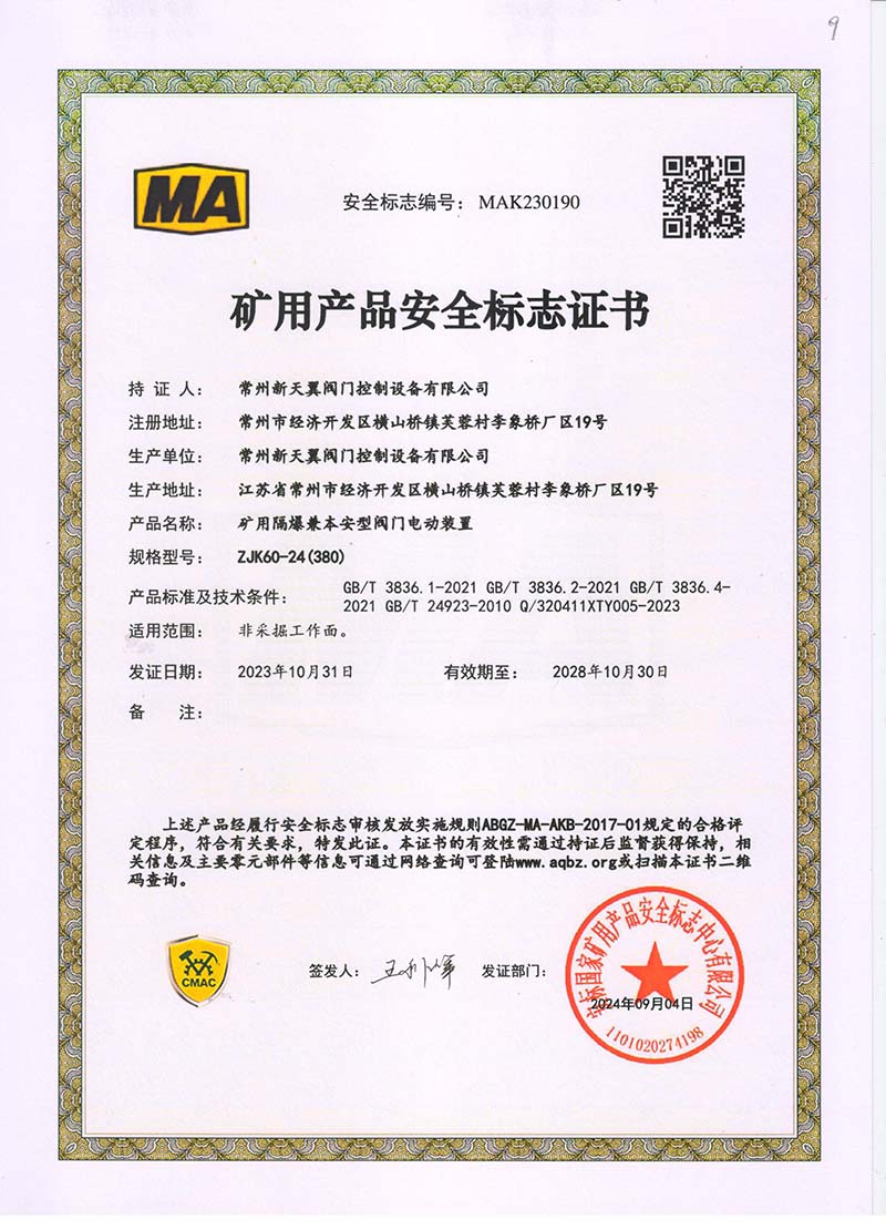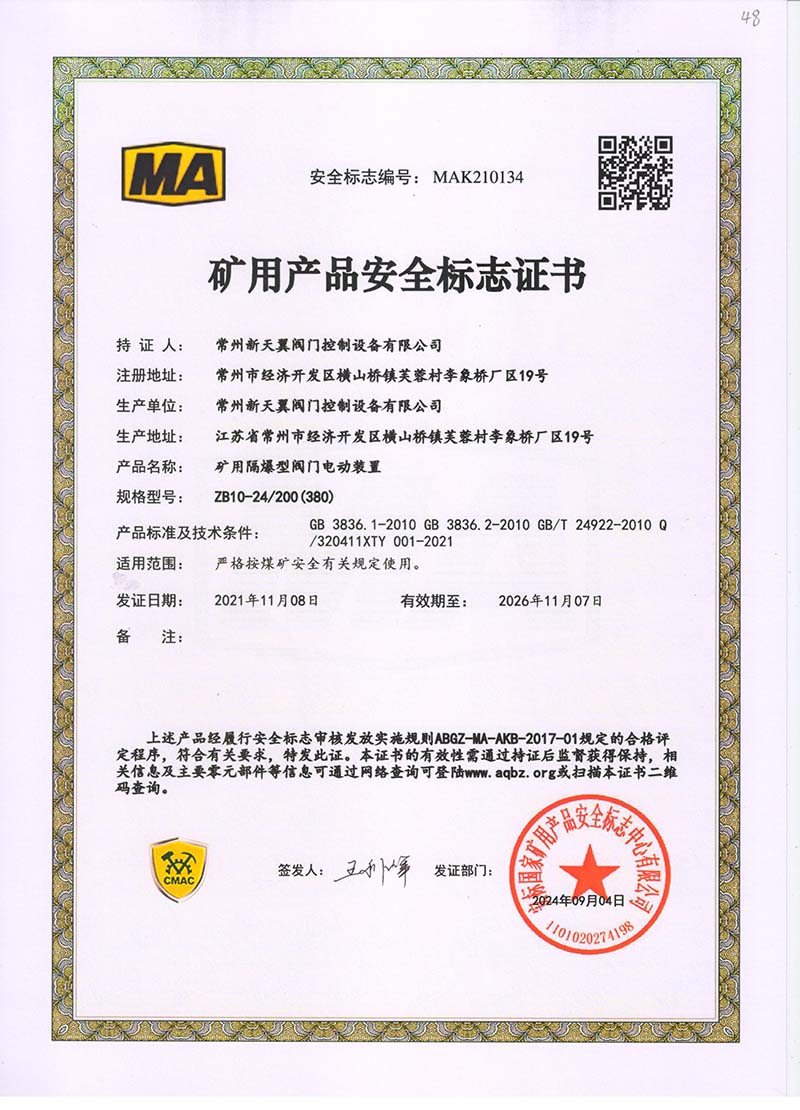 礦用隔爆ZB10-24中國國家強制性產品認證證書110.2