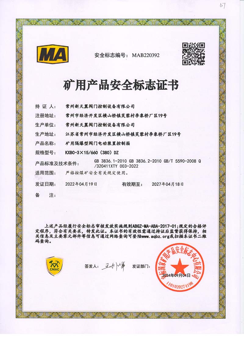 礦用產品安全標志證書KXBC-1 15 660(380)DZ